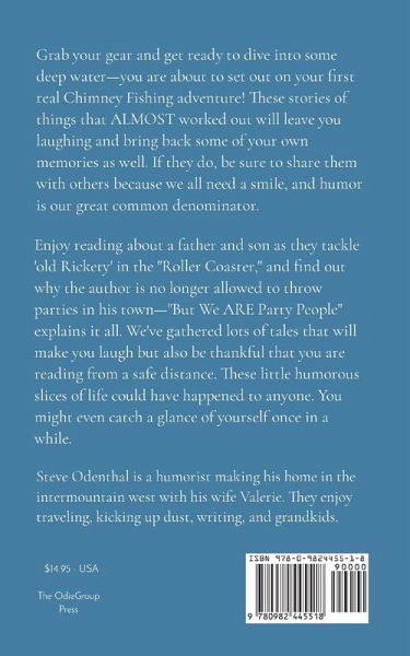 This book may be a desperate cry for help or a set of the funniest slices of life you will read this year. Steve Odenthal takes an adventure we can all relate to and full-throttles it down the wrong track every time-and we know how hard it is to avert your eyes from a train wreck. That is just how this man's life goes, and, conveniently, how Chimney Fishing Tales are born.This collection of fourteen stories sheds light on how the author became a black-belt chimney fishing ninja and established his street-cred. Each chimney fishing tale maps a milestone in life. Whether it is a boy's first brush with love in "Fourth Grade Romeo," a father and son's first official ride down 'Ol Rickety in "The Roller Coaster-A Rite of Passage," or a fishing trip gone awry in "Fishing the Trout Farm," you will follow, let's just say unique adventures. You might just catch a glimpse of yourself along the way. Great fun for readers of all ages!Included in this collection are "Chimney Fishing in the Rockies," "Tenacious Monkey Bites," "Fourth Grade Romeo," "A Pipe Smokin' Mind," "The Wal-Mart Trip," "Fishing the Trout Farm," "The Roller Coaster," "Modest Crews and other Sports Trivia," "Zero Three November," "We Don't Darn Socks," "Best 10-Minute Hat," "Driving Dainty," "When the Going Gets Tough," "But We ARE Party People." These accounts of things that almost went right are sure to leave you laughing-and thankful you maintained a safe distance from this family. Grab your gear and get ready to dive into some deep water-you are about to set out on your first real Chimney Fishing adventure! These stories of things that ALMOST worked out will leave you laughing and bring back some of your own memories as well. If they do, be sure to share them with others because we all need a smile, and humor is our great common denominator.