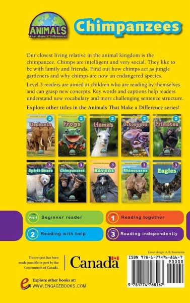 Our closest living relative in the animal kingdom is the chimpanzee. Chimps are intelligent and very social. They like to be with family and friends. Find out how chimps act as jungle gardeners and why chimps are now an endangered species. Level 3 readers are aimed at children who are reading by themselves and can grasp new concepts. Key words and captions help readers understand new vocabulary and more challenging sentence structure. This project has been made possible in part by the Government of Canada.
