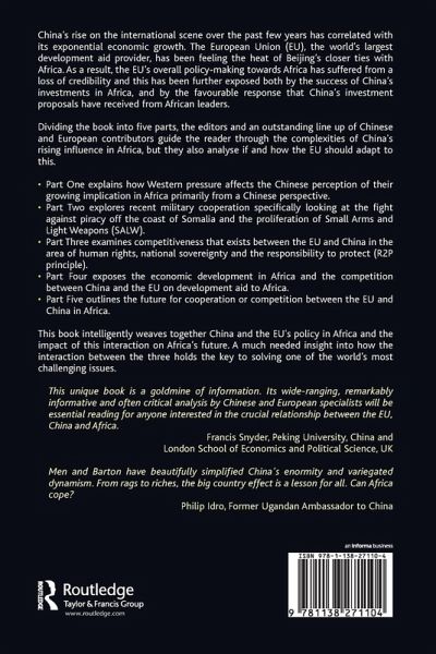 China's rise on the international scene over the past few years has correlated with its exponential economic growth. The European Union (EU), the world's largest development aid provider, has been feeling the heat of Beijing's closer ties with Africa. As a result, the EU's overall policy-making towards Africa has suffered from a loss of credibility and this has been further exposed both by the success of China's investments in Africa, and by the favourable response that China's investment proposals have received from African leaders. Dividing the book into five parts, the editors and an outstanding line up of Chinese and European contributors guide the reader through the complexities of China's rising influence in Africa, but they also analyse if and how the EU should adapt to this. "