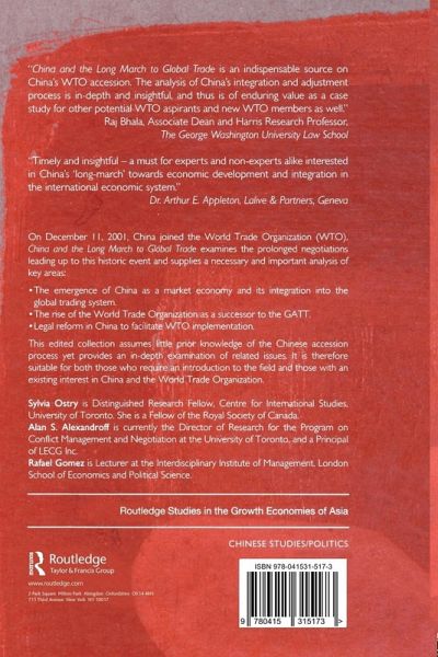 On December 11th 2001, China joined the World Trade Organization (WTO). China and the Long March to Global Trade examines the prolonged negotiations leading up to this historic event. This edited collection assumes little prior knowledge of the Chinese accession process yet provides an in-depth examination of the related issues. It is therefore suitable for both those who require an introduction to the field and those with an existing interest in China and the World Trade Organization.