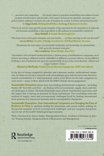 In the face of strong competitive pressure and a dynamic market, multinational companies in China are forced to innovate with extraordinary pace and inventiveness. Environmental sustainability is a vital benchmark, and is a key driver for the best companies in each sector - many of them allied with the WWF Climate Savers programme. Sustainable Champions shows how nine leading multinational companies - including Nestlé, HP, Tetra Pak and Sony - are dealing with environmental, supply chain and ethical challenges in China. The book illuminates some of their transformative practices, and the impact this is having on business in China and beyond. The concluding cross-case analysis of supply chain and environmental challenges faced by leading international firms presents key lessons for business and for sustainability champions. Sustainable Champions: How International Companies are Changing the Face of Business in China is essential reading for researchers and course leaders seeking on-the-ground examples of local environmental challenges, and any company doing business in one of the world's fastest-growing economies. With a Foreword by Simon Zadek, Distinguished Fellow, Academy of Business in Society, Visiting Scholar, Tsinghua School of Economics and Management.