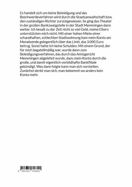 Es handelt sich um keine Beleidigung und das Beschwerdeverfahren wird durch die Staatsanwaltschaft bzw. den zuständigen Richter zurückgewiesen. So ging das Theater in der großen Bankzweigstelle in der Stadt Memmingen dann weiter. Ich besaß zu der Zeit nicht so viel Geld, meine Eltern unterstützten mich nicht. Mit einer hohen Miete einer schandhaften, schlechten Stadtwohnung kam mein Konto am Monatsende gelegentlich über das Limit, das 3.000 Euro betrug. Sonst hatte ich keine Schulden. Mit einem Grund, der für mich bagatellmäßig war, wurde dann zum Beleidigungsverfahren, das durch das Amtsgericht Memmingen abgelehnt wurde, dazu mein Konto durch die große, und damit eigentlich vorbildhafte Bankfiliale gekündigt. Was dann folgte kann man sich vorstellen. Zunächst denkt man sich, man bekommt wo anders kein Konto mehr.