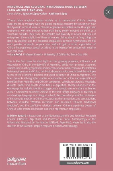 This is the first book to shed light on the growing presence, influence and expansion of China in the daily life of Argentina. While most previous academic studies focus on the geopolitical and macroeconomics dimensions of the relations between Argentina and China, this book shows at a micro-social level the multiple facets of the economic, political and social influence of China in Argentina. The book presents ethnographic studies of encounters of actors and negotiation of identities from Argentina and China in companies, schools, restaurants, hospitals, districts, public and private institutions in Argentina. Themes discussed in the ethnographies include: identity struggle and strategic uses of culture in Buenos Aires' s Chinatown; teaching Chinese as the first foreign language or teaching it as a heritage language in a bilingual school; the contested production of images of Chinese authenticity in Chinese restaurants; the connections and contestations between so-called "Western medicine" and so-called "Chinese Traditional Medicine"; and the conflictive relations between Chinese expatriate bosses of Chinese state-owned enterprises and their Argentinean employees.