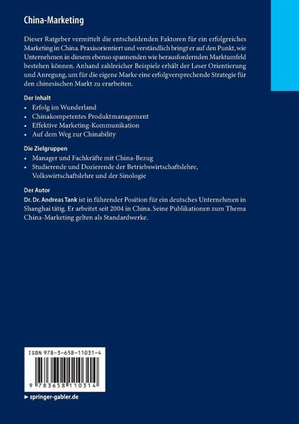 Dieser Ratgeber vermittelt die entscheidenden Faktoren für ein erfolgreiches Marketing in China. Praxisorientiert und verständlich bringt er auf den Punkt, wie Unternehmen in diesem ebenso spannenden wie herausfordernden Marktumfeld bestehen können. Anhand zahlreicher Beispiele erhält der Leser Orientierung und Anregung, um für die eigene Marke eine erfolgversprechende Strategie für den chinesischen Markt zu erarbeiten.