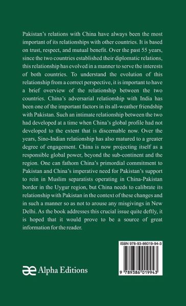 Pakistan's relations with China have always been the most important of its relationships with other countries. It is based on trust, respect, and mutual benefit. Over the past 55 years, since the two countries established their diplomatic relations, this relationship has evolved in a manner to serve the interests of both countries. To understand the evolution of this relationship from a correct perspective, it is important to have a brief overview of the relationship between the two countries. China's adversarial relationship with India has been one of the important factors in its all-weather friendship with Pakistan. Such an intimate relationship between the two had developed at a time when China's global profile had not developed to the extent that is discernable now. Over the years, Sino-Indian relationship has also matured to a greater degree of engagement. China is now projecting itself as a responsible global power, beyond the sub-continent and the region. One can fathom China's primordial commitment to Pakistan and China's imperative need for Pakistan's support to rein in Muslim separatists operating in China-Pakistan border in the Uygur region, but China needs to calibrate its relationship with Pakistan in the context of these changes and in such a manner so as not to arouse any misgivings in New Delhi. As the book addresses this crucial issue quite deftly, it is hoped that it would prove to be a source of great information for the reader.