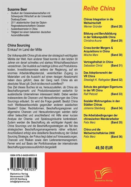 Die Volksrepublik China gilt als einer der strategisch wichtigsten Märkte der Welt. Kein anderer Staat konnte in den letzten 30 Jahren ein derart schnelles und starkes Wirtschaftswachstum verzeichnen. Seit der Öffnung 1979 wurde jährlich ein durchschnittliches Wachstum von 10% erzielt. Der Ausblick auf niedrige Löhne und Produktionskosten, Investitionsanreize seitens der Regierung, ein enormes Arbeitskräftepotenzial, vereinfachten Zugang zu Materialien und die Aussicht auf einen riesigen Absatzmarkt haben dazu geführt, dass der Gang nach China als ein absolutes Muss gilt. Doch ist dies noch zutreffend? Das Ziel dieses Buches ist es, herauszustellen, ob China als Beschaffungsmarkt und Produktionsstandort weiterhin für ausländische Unternehmen interessant bleibt. Dabei werden insbesondere die Chancen und Herausforderungen des China Sourcings erläutert. Nach einer kurzen geschichtlichen Einleitung wird der Blick auf den chinesischen Markt gelegt. Hier wird die Frage gestellt: Besitzt China noch Wettbewerbsvorteile gegenüber anderen asiatischen Staaten? Güter, Rechtsformen, Beschaffungsregionen und allgemeine Chancen und Herausforderungen werden dafür näher beleuchtet und anschließend mit Hilfe einer kurzen Analyse der Chemie- und Spielzeugindustrie konkretisiert.