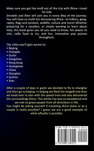 Make sure you get the most out of the trip with china- travel for kids Dinobibi and chen will join you in every step of the journey. You will have so much fun discovering china- its history, geography, flags and symbols, wildlife, culture and more! Whether preparing for a vacation, or simply wanting to learn about italy, this book gives you all you need to know, fun places to visit, tasty food to try, and fun, interactive pop quizzes throughout. The cities you'll gain access to:Beijing Chengdu Guilin Hangzhou Hong kong Huangshan Lhasa Shanghai Suzhou Xian After a couple of days in guilin we decided to fly to shanghai and then go to beijing. In beijing we staid the longest and then we head over to xian with the speed train and also discovered the surroundings there. This whole trip was so exceptional and we met so great people from all directions in life. You might be asking yourself if travelling china alone or as a couple is really possible? I guess we are a good example of what actually is possible.