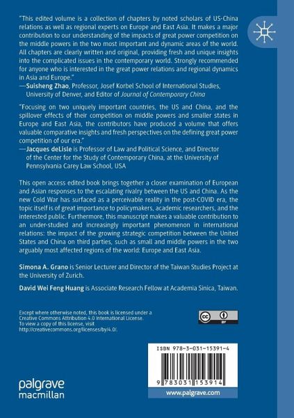 This open access edited book brings together a closer examination of European and Asian responses to the escalating rivalry between the US and China. As the new Cold War has surfaced as a perceivable reality in the post-COVID era, the topic itself is of great importance to policymakers, academic researchers, and the interested public. Furthermore, this manuscript makes a valuable contribution to an under-studied and increasingly important phenomenon in international relations: the impact of the growing strategic competition between the United States and China on third parties, such as small and middle powers in the two arguably most affected regions of the world: Europe and East Asia. The European side has been under-studied and explicitly comparative work on Europe and East Asia is extremely rare. Given that the manuscript focuses heavily on recent developments¿and because many of these developments have been quite dramatic¿there are very few publications that cover the same topics.