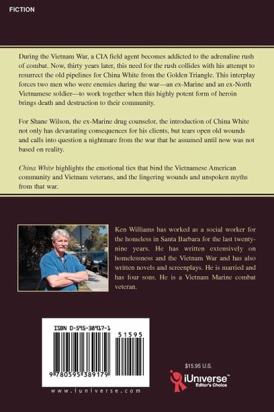 During the Vietnam War, a CIA field agent becomes addicted to the adrenaline rush of combat. Now, thirty years later, this need for the rush collides with his attempt to resurrect the old pipelines for China White from the Golden Triangle. This interplay forces two men who were enemies during the war-an ex-Marine and an ex-North Vietnamese soldier-to work together when this highly potent form of heroin brings death and destruction to their community. For Shane Wilson, the ex-Marine drug counselor, the introduction of China White not only has devastating consequences for his clients, but tears open old wounds and calls into question a nightmare from the war that he assumed until now was not based on reality. China White highlights the emotional ties that bind the Vietnamese American community and Vietnam veterans, and the lingering wounds and unspoken myths from that war.