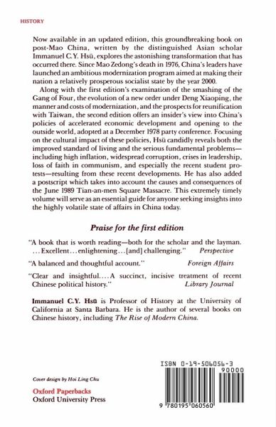 This concise overview of China's development since Mao's death in 1976 has been substantially expanded for the new edition to take into account the dramatic changes of recent years. Special attention is paid in this edition to recent student protests; the social effects of Deng Xiaoping's `capitalistic' reforms; the cultural impact of the Open Door policy; and the evolving relations between Taiwan and mainland China. The book includes a postscript on the demonstrations at Tian-an-men Square and the crackdown of 3-4 June 1989, along with an analysis of the social and political effects of these events.