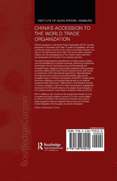 With China's accession to the World Trade Organization imminent, this book brings together the expert views of scholars, policy-makers and business representatives on the consequences of this historic event. Insight into the past and future of China's relationship to the WTO is offered by authors involved on both sides of the negotiations on the EU-China bilateral agreement of May 2000 and the on-going negotiations up to spring 2001. An analyst and representatives from four economic sectors (the automobile industry, telecommunications, insurance and banking) clash over their predictions for the future. Also presented is an investigation of the challenges for China's political, social and legal systems, and revealing prognoses are given for the implications for global trade and investment flows for the EU and Greater China, and for the modus operandi of the WTO itself. By shedding light on economic effects and social and legal implications, the book gives a comprehensive picture of potential challenges arising from China's entry to the WTO.