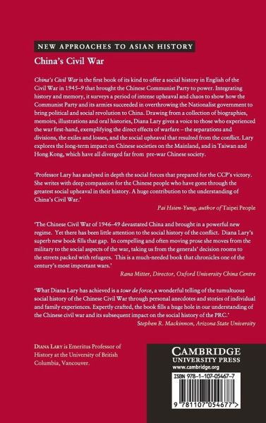 China's Civil War is the first book of its kind to offer a social history in English of the Civil War in 1945-9 that brought the Chinese Communist Party to power. Integrating history and memory, it surveys a period of intense upheaval and chaos to show how the Communist Party and its armies succeeded in overthrowing the Nationalist government to bring political and social revolution to China. Drawing from a collection of biographies, memoirs, illustrations and oral histories, Diana Lary gives a voice to those who experienced the war first-hand, exemplifying the direct effects of warfare - the separations and divisions, the exiles and losses, and the social upheaval that resulted from the conflict. Lary explores the long-term impact on Chinese societies on the Mainland, Taiwan and Hong Kong, which have all diverged far from pre-war Chinese society.