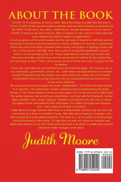 COVID-19. It unleashed all hell on earth. Since first being recorded late last year in China, COVID-19 has spread rapidly worldwide and has been declared a pandemic by the WHO. In this book, the author, Judith Moore, reveals that there is much more to COVID-19 than we are led to believe. Was it created in a lab, and has China silenced every person who tried to speak out against this? A cursory glance at the world reveals that the real state of freedom in different parts of the world is not very promising because of China's ambitions to become a superpower. China has gone from being a divided nation during colonization to fighting proxies with the U.S during the Cold War. Now, the country is eyeing the superpower position, which is currently held by the U.S. These authoritarians commit such horrific and inhumane atrocities and then turn around and punish the victims for the crimes they are executing on them. That is what power can do to those who hold it. It gives the will to destroy. China has vast influence and interference to dominate the globe. The Chinese are in our universities, government, movies, etc. Judith Moore strongly believes in president Donald Trump and how this election was stolen from him! Online and in the media, conservative voices are being silenced; they are being attacked and banned from social media platforms. No president should be brought into power 'illegitimately.' The 2020 American election is in question. The mainstream media is playing a part in brainwashing the public. People of The United States of America must speak out. It is all up to you to fight back! The author believes that we all have something in common with the dissidents, human rights activists, Falun Gong, Uyghurs, Tibetans, and anyone else who tries to speak out against these authoritarians that hold power. It is called Leverage and Suppression. That's what we all have in common! Judith Moore strongly believes that China is a Global Bully, and the only one who has ever stood up to them is President Trump. She talks about hacking, corruption, and their involvement in the global pandemic. The book is a call for action to all the people around the world to take action. It's high time we raise our voices for freedom and democracy before it's too late! That's what this book is all about; a subtle and powerful attempt to make changes come about.