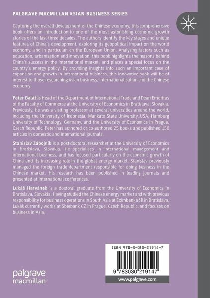 Peter Balá is Head of the Department of International Trade and Dean Emeritus of the Faculty of Commerce at the University of Economics in Bratislava, Slovakia. Previously he has been a visiting professor at several universities around the world including the University of Indonesia, Minnesota State University, USA, Hamburg University of Technology, Germany, and the University of Economics in Prague, Czech Republic. Peter has authored or co-authored 25 books and published 150 articles in international journals. Stanislav Zábojnik is a post-doctoral researcher at the University of Economics in Bratislava, Slovakia. He specialises in international management and international business, and has focused particularly on the economic growth of China and its increasing role in the global energy market. Stanislav was previously the head of the foreign trade department in a commercial company, where he was responsible for trade with Chinese companies. His research has been published in many leading journals and presented at international conferences. Luká Harvánek is a doctoral graduate from the University of Economics in Bratislava, Slovakia. Having studied the Chinese energy market and previously been responsible of business operations in South Asia at Eximbanka SR in Bratislava, Luká currently works at Sberbank CZ in Prague, Czech Republic, and focuses on business in Asia.