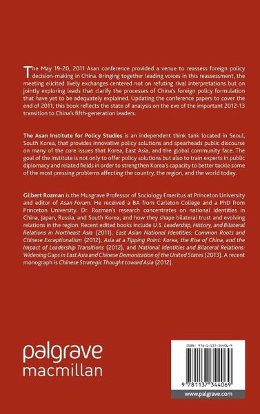 Introduction: Gilbert Rozman PART I: CHINA'S LEADERSHIP AND FOREIGN POLICY 1. More Actors, Less Coordination? New Challenges for the Leaders of a Rising China; Thomas Christensen 2. China's Foreign Policy and the Leadership Transition: Prospects for Change under the 'Fifth Generation'; Avery Goldstein 3. Another Take on Prospects for the Foreign Policy of the Chinese Fifth-Generation Leadership; Shin Jung-seung PART II: CHINA'S THINK TANKS AND FOREIGN POLICY 4. Chinese Foreign Policy Research Institutes and the Practice of Influence; Bonnie S. Glaser 5. Moving between the 'Inner Circle' and the 'Outer Circle': The Limited Impact of Think Tanks on Policy Making in China; Quansheng Zhao PART III: CHINA'S NATIONAL IDENTITY AND FOREIGN POLICY 6. Chinese National Identity and Foreign Policy: Linkages between the Two; Gilbert Rozman 7. Chinese Nationalism and the American Response: Sources of Tension and Prospects for Renewed Cooperation; Robert S. Ross PART IV: FINANCIAL FACTORS IN CHINESE FOREIGN POLICY MAKING 8. China's Leadership and Their Financial and Monetary Policies; William H. Overholt 9. How Do Monetary and Financial Issues Interact with China's Foreign Policy Making?; François Godemont PART V: CHINA'S FOREIGN POLICY TOWARD THE KOREAN PENINSULA 10. China's North Korea Policy: Misperception and Reality (An Independent Chinese Perspective on Sino-Korean Relations); Chen Ping 11. China's Korea Policy in the Making; Yufan Hao 12. Disillusionment and Dismay: How Chinese Netizens Think and Feel about the Two Koreas; Peter Gries Index