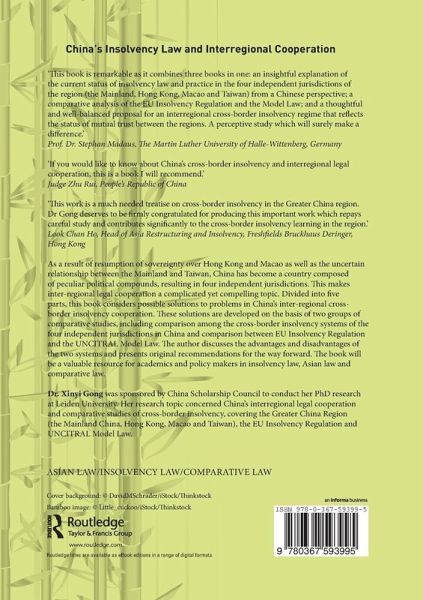 As a result of resumption of sovereignty over Hong Kong and Macao as well as the uncertain relationship between the Mainland and Taiwan, China has become a country composed of peculiar political compounds, resulting in four independent jurisdictions. This makes inter-regional legal cooperation a complicated yet compelling topic. Divided into five parts, this book considers possible solutions to problems in China's inter-regional cross-border insolvency cooperation. These solutions are developed on the basis of two groups of comparative studies, including comparison among the cross-border insolvency systems of the four independent jurisdictions in China and comparison between EU Insolvency Regulation and the UNCITRAL Model Law. The author discusses the advantages and disadvantages of the two systems and presents original recommendations for the way forward. The book will be a valuable resource for academics and policy makers in insolvency law, Asian law and comparative law.