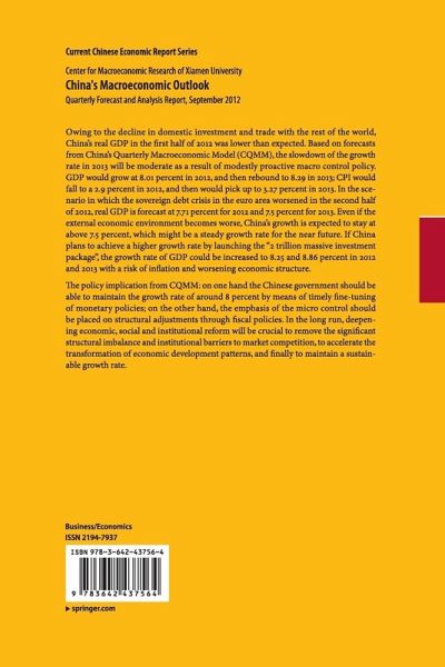 Owing to the decline in domestic investment and trade with the rest of the world, China's real GDP in the first half of 2012 was lower than expected. Based on forecasts from China's Quarterly Macroeconomic Model (CQMM), the slowdown of the growth rate in 2013 will be moderate as a result of modestly proactive macro control policy. GDP would grow at 8.01 percent in 2012, and then rebound to 8.29 in 2013; CPI would fall to a 2.9 percent in 2012, and then would pick up to 3.27 percent in 2013. In the scenario in which the sovereign debt crisis in the euro area worsened in the second half of 2012, real GDP is forecast at 7.71 percent for 2012 and 7.5 percent for 2013. Even if the external economic environment becomes worse, China's growth is expected to stay at above 7.5 percent, which might be a steady growth rate for the near future. If China plans to achieve a higher growth rate by launching the "2 trillion massive investment package", the growth rate of GDP could be increasedto 8.25 and 8.86 percent in 2012 and 2013 with a risk of inflation and worsening economic structure.
