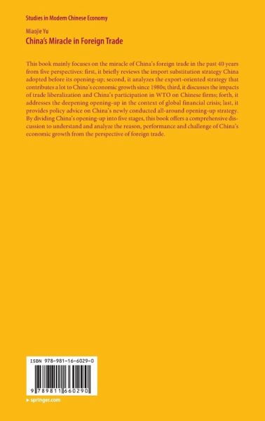 This book mainly focuses on the miracle of China's foreign trade in the past 40 years from five perspectives: first, it briefly reviews the import substitution strategy China adopted before its opening-up; second, it analyzes the export-oriented strategy that contributes a lot to China's economic growth since 1980s; third, it discusses the impacts of trade liberalization and China's participation in WTO on Chinese firms; forth, it addresses the deepening opening-up in the context of global financial crisis; last, it provides policy advice on China's newly conducted all-around opening-up strategy. By dividing China's opening-up into five stages, this book offers a comprehensive discussion to understand and analyze the reason, performance and challenge of China's economic growth from the perspective of foreign trade.