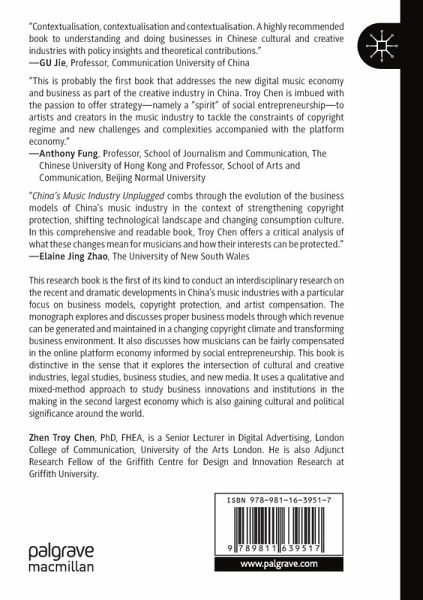 This research book is the first of its kind to conduct an interdisciplinary research on the recent and dramatic developments in China's music industries with a particular focus on business models, copyright protection, and artist compensation. The monograph explores and discusses proper business models through which revenue can be generated and maintained in a changing copyright climate and transforming business environment. It also discusses how musicians can be fairly compensated in the online platform economy informed by social entrepreneurship. This book is distinctive in the sense that it explores the intersection of cultural and creative industries, legal studies, business studies, and new media. It uses a qualitative and mixed-method approach to study business innovations and institutions in the making in the second largest economy which is also gaining cultural and political significance around the world.
