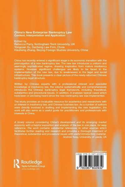 China has recently entered a significant stage in its economic transition with the introduction of a new and seemingly sophisticated bankruptcy law drawing inspiration from mature insolvency systems. However, this new law is likely to face significant challenges within its implementation due to weaknesses in the countries legal and social infrastructure. China's New Enterprise Bankruptcy Law clearly presents the structure of China's reformed legal bankruptcy system by introducing the framework and analyzing typical cases which have been or are being heard since the new bankruptcy law was operational. Written by Chinese experts with a professional interest and specialist knowledge of insolvency law, this volume serves as an indispensable guide for academics and researchers in the area, as well as practitioners and professionals involved with Chinese business law.