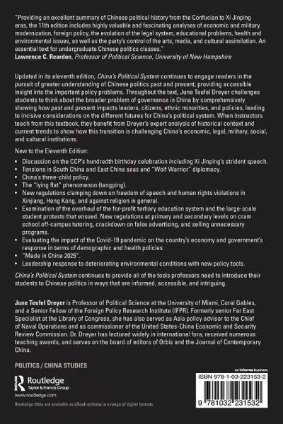 Updated in its eleventh edition, China's Political System continues to engage readers in the pursuit of greater understanding of Chinese politics past and present, providing accessible insight into the important policy problems. Throughout the text, June Teufel Dreyer challenges students to think about the broader problem of governance in China by comprehensively showing how past and present impacts leaders, citizens, ethnic minorities, and policies, leading to incisive considerations on the different futures for China's political system. When instructors teach from this textbook, they benefit from Dreyer's expert analysis of historical context and current trends to show how this transition is challenging China's economic, legal, military, social, and cultural institutions.