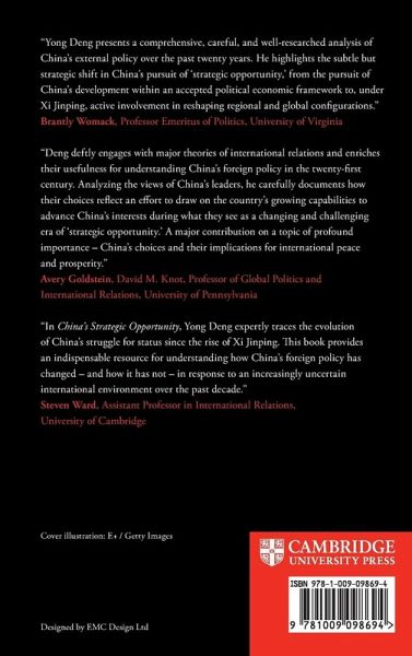 "This book offers a systematic study of China's great-power diplomacy under President Xi Jinping. It critically applies the Chinese concept of 'strategic opportunity,' which is defined by the national ambitions as set by the ruling communist party leadership, the opportunities and risks presented in the international environment, and the policy instruments at the nation's disposal. Applying the dynamic concept, the book identifies key Chinese beliefs that seek to best match its resources with its policy ends and investigates policy patterns in China's management of competition with the United States, the Belt and Road Initiative, economic statecraft, regional and global institutional orders, and its multipolar diplomacy. Taking seriously China's choice, Yong Deng challenges the mainstream structural analysis in international relations that focuses merely on rising powers' insecurity and discontent within the international system. His study shows how China, the major stakeholder in the world order, actually evaluates and actively seeks to control its international environment"