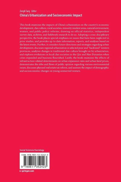 This book examines the impacts of China's urbanization on the country's economic development, clan culture, rural societies, minority resident areas, natural environment, women, and public policy reforms, drawing on official statistics, independent survey data, archives, and fieldwork research to do so. Adopting a cross-disciplinary perspective, the book places special emphasis on issues that have been neglected in prior studies, and provides up-to-date information, reports, and analyses based on the latest events. Further, it considers future directions and strategies regarding urban development, discusses regional urbanization in selected poor and "backward" western provinces, analyzes changes in traditional clan culture brought on by urbanization, and explores evolutions in local clan societies in the Qin and Han Dynasties when cities expanded and business flourished. Lastly, the book examines the effects of infrastructure-related determinants on urban expansion rates and urban land prices, demonstrates the ebbs and flows of public opinion regarding various environmental issues, discusses planned real estate tax reform, and assesses the impact of demographic and socioeconomic changes on young unmarried women.