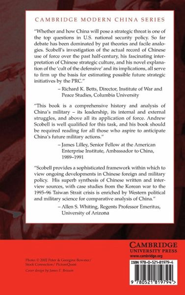 In this 2003 study of China's militarism, Andrew Scobell examines the use of military force abroad - as in Korea (1950), Vietnam (1979), and the Taiwan Strait (1995-6) - and domestically, as during the Cultural Revolution of the late 1960s and in the 1989 military crackdown in Tiananmen Square. Debunking the view that China has become increasingly belligerent in recent years because of the growing influence of soldiers, Scobell concludes that China's strategic culture has remained unchanged for decades. Nevertheless, the author uncovers the existence of a 'Cult of Defense' in Chinese strategic culture. The author warns that this 'Cult of Defense' disposes Chinese leaders to rationalize all military deployment as defensive, while changes in the People's Liberation Army's doctrine and capabilities over the past two decades suggest that China's twenty-first century leaders may use military force more readily than their predecessors.