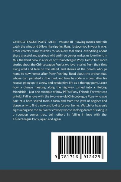 CHINCOTEAGUE PONY TALES - Volume III Flowing manes and tails catch the wind and billow like rippling flags. It stops you in your tracks. From velvety mare muzzles to whiskery foal chins, everything about these graceful and glorious wild and free ponies makes us love them. In this, the third book in a series of "Chincoteague Pony Tales" by author Lois Szymanski, find more stories about the Chincoteague Ponies we love- stories from their time living wild and free on the island, and stories of the ponies who go home to new homes after Pony Penning. Read about the orphan foal, whose dam perished in the mud, and how he rode in a boat after his rescue, going on to a new and productive life as a therapy pony. Learn how a chance meeting along the highway turned into a lifelong friendship - just one example of how PFFs (Pony Friends Forever) can unfold. Fall in love with the two-year-old Chincoteague Pony who was part of a herd seized from a farm and from the jaws of neglect and abuse, only to find a new and loving forever home. Watch for heavenly signs alongside the saltwater cowboy whose lifelong dream of riding in a roundup comes true. Join others in falling in love with the Chincoteague Pony, again and again.
