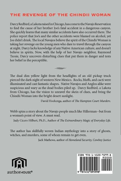 Darcy Redbird, a Lakota raised in Chicago, has come to the Navajo Reservation to find the cause of her brother Joe's fatal accident in a dangerous canyon. She quickly learns that many similar accidents have also occurred there. The police report that Joe's and the other accidents were blamed on alcohol, yet Joe didn't drink. The local Navajos believe the spirit of the Chindii Woman is taking her revenge on the young men who dare to travel through the canyon at night. Darcy lacks knowledge of any Native American culture, and doesn't believe in spirits. Now, with the help of her Navajo neighbor, Raymond Tsosie, Darcy uncovers disturbing clues that put them in danger and tests her belief in the perceptible. The dual dim yellow light from the headlights of an old pickup truck pierced the dark night of western New Mexico. Rocks, bluffs, and cacti were illuminated and cast fantastic shapes. Native Navajos and Anglos alike were suspicious and wary as the dead bodies piled up. Darcy Redbird, a Lakota from Chicago, has the vision to unravel the skein of clues, and bring the Chindii Woman into the bright desert sunlight. David Hoekenga, author of The Hampton Court Murders. Webb spins a story about the Navajo people much like Hillerman--but from a woman's point of view. A must read. Judy Cicero Hilbert, Ph.D., Author of The Extraordinary Magic of Everyday Life.