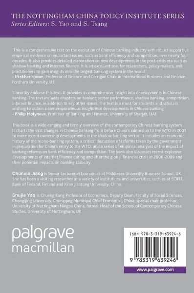 The book begins with an economic history of the mono-banking system, and a critical discussion of reforms taken by the government in preparation for China's entry to the WTO. The second part of the book discusses banking regulation and government policy during and after the global financial crisis in 2008-2009 and their impact on banking, including recent developments. Finally, the book concludes an empirical analysis of the impact of banking reforms on a number of important issues, including bank efficiency, capital structure, competition and financial stability, and risk taking behaviour, and a review of the relevance of shadow banking and internet banking.