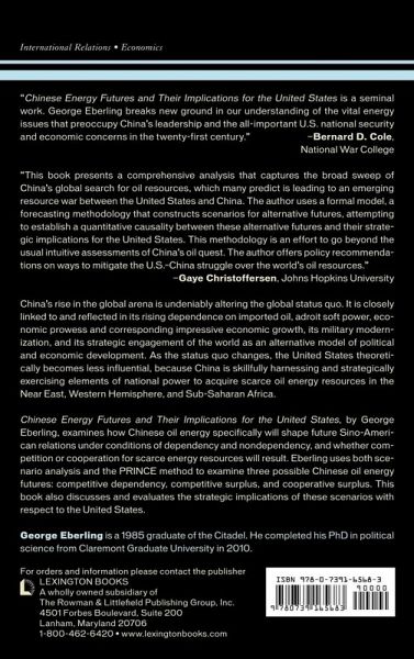 Chinese Energy Futures and Their Implications for the United States, by George Eberling, shows how China will most likely address its growing oil energy dependence. Eberling's study uses scenario analysis and the PRINCE model to determine what will be the most likely U.S. foreign policy consequences, stemming from the most current literature available on energy security and foreign policy. Chinese Energy Futures also contributes to the literature on Chinese and United States energy security, foreign policy, political economy, and political risk analysis.