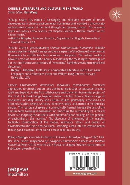 1. Environing at the Margins: Huanjing as a Critical Practice.- Section I Chinese Ecocriticism and Ecotranslation Studies.- 2. Building a Post-Industrial Shangri-La: Lu Shuyuan, Ecocriticism, and Tao Yuanming's "Peach-Blossom Spring".- 3. The Nakedness of Hope: Solastalgia and Soliphilia in the Writings of Yu Yue, Zhang Binglin, and Liang Shuming.- 4. Blurred Centers/Margins: Ethnobotanical Healing in Writings by Ethnic Minority Women in China.- 5.From Jiang Rong to Jean-Jacques Annaud: An Ecological Rewrite of Wolf Totem.- 6. An Ecotranslation Manifesto: On the Translation of Bionyms in Nativist and Nature Writing from Taiwan.- Section II Chinese Ecocinema and Ecomedia Studies.- 7. Worms in the Anthropocene: The Multispecies World in Xu Bing's Silkworm Series.- 8. Place, Animals, and Human Beings: The Case of Wang Jiuliang's Beijing Besieged by Waste.- 9. Land, Technological Triumphalism and Planetary Limits: Revisiting Human-Land Affinity.- 10. Ecomedia Events in China: From Yellow Eco-Peril to Media Materialism.- Section III Sustainability, Organic Community, and Buddhist Multispecies Ethics.- 11 The Paradox of China's Sustainability.- 12 Contemplating Land: An Ecocritique of Hong Kong.- 13. The Intersection of Sentient Beings and Species, Traditional and Modern, in the Practices and Doctrine of Dharma Drum Mountain.- 14. An Exposition of the Buddhist Philosophy of Protecting Life and Animal Production.