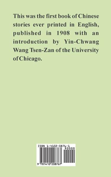 This was the first book of Chinese stories ever printed in English, published in 1908 with an introduction by Yin-Chwang Wang Tsen-Zan of the University of Chicago.