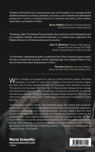 With a strategic and geopolitical view on China's financial system, this book explores a number of roles that it plays in the world's second largest economy. The first key mission has been the financing of the domestic economy. The second one has been the financing of infrastructures (transportation, energy, and telecommunication) to offer companies a conducive environment to develop manufacturing facilities. Thirdly, it supports Chinese foreign investment. The final and most recent role is the active use of technology in finance and investment to collect big data. The book supports three theses. The first thesis argues that finance and investment are not only the product of market forces but also other dimensions like regulations, geopolitics, technology and internal governance. Another thesis is that the State Council is metaphorically the conductor, and financial and economic actors are the performers who must imperatively follow the conductor. Last but not least, the third thesis is that the sino-centric perspective adopted by the Chinese authorities impedes foreign entry. Contrary to industries opened to foreign companies, the Chinese government left ajar the door to banking industry - characterizing foreign banks as marginal actors in the system.