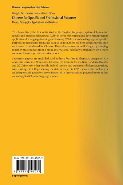 This book, likely the first of its kind in the English language, explores Chinese for specific and professional purposes (CSP) in terms of theorizing and developing practical applications for language teaching and learning. While research in language for specific purposes is thriving for languages such as English, there has been comparatively little such research conducted for Chinese. This volume attempts to fill the gap by bringing together practitioners from a broad international scholarly community, who share common interests yet diverse orientations. Seventeen papers are included, and address four broad thematic categories: (1) academic Chinese, (2) business Chinese, (3) Chinese for medicine and health care, and (4) Chinese for other broadly defined services and industries (diplomacy, tourism, wine-tasting, etc.). Representing the state of the art in CSP research, the book offers an indispensable guide for anyone interested in theoretical and practical issues in this area of applied Chinese language studies.
