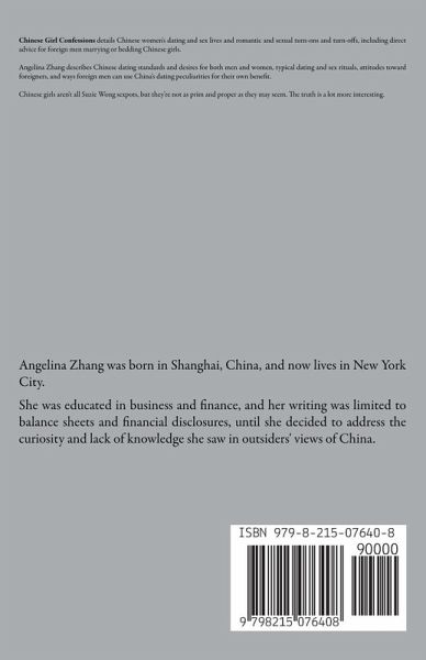 Forget what you think you know about "shy, innocent" Asian women. You've seen the stereotypes: the demure, submissive good girl or the exotic, hyper-sexualized seductress. But if you are a Western man looking for love (or lust) in China, believing those myths will leave you broke, confused, and possibly with wrist pain. In Chinese Girl Confessions, Angelina Zhang pulls back the curtain on the private lives, bedroom habits, and dating strategies of modern Chinese women. This is a raw, no-holds-barred guide to what really happens behind closed doors. Discover: * The Myth of Innocence: Why we pretend to be shy virgins while hiding vibrant secret lives. * Bedroom Confidential: The blunt truth Chinese women won't say out loud: about Oral Roberts, shaving and forests, and why most Chinese couples are missionaries. * The "Leftover" Opportunity: Why beautiful, successful women are "damaged goods" by Chinese dating standards-and why those women are the single greatest opportunity for you. * The Green Card Test: A fail-safe method to discover if she loves you for your soul or your passport. * Money Over Romance: How to navigate a dating culture where asking for a salary history is a normal first-date conversation. * Digital Hunting Grounds: How to master Tantan and WeChat to find real women and avoid the scammers. * The Truth About Size: Do Chinese men really suffer from smallcox? The answer might surprise you. Whether you are an expat living in Shanghai, a traveler planning a trip, or a man dating (or chasing after) a Chinese woman in the US, this book grants you a very unfair advantage. We aren't all Suzie Wong sexpots, but we aren't as innocent as we seem. It's time you learn the truth.
