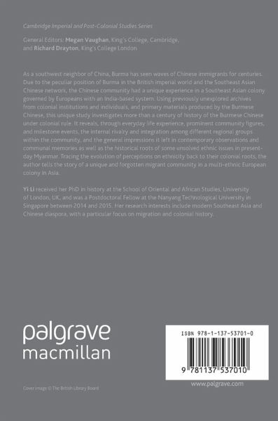 Using previously unexplored archives from colonial institutions and individuals, and primary materials produced by the Burmese Chinese, this comprehensive study investigates over a century of history of the Burmese Chinese under British colonial rule. Due to the peculiar position of Burma in the British imperial world and the Southeast Asian Chinese network, the Chinese community had a unique experience in a Southeast Asian colony governed by Europeans with an India-based system. This book reveals, through everyday life experience, prominent community figures, and milestone events, the internal rivalry and integration among different regional groups within the community, and the general impressions it left in contemporary observations and communal memories. The book also traces historical roots of some unsolved ethnic issues in present-day Myanmar.