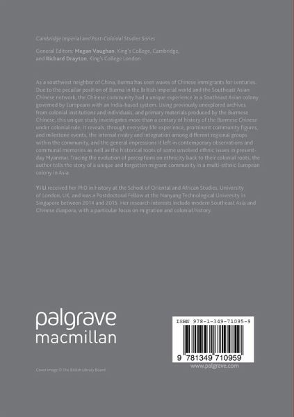 Using previously unexplored archives from colonial institutions and individuals, and primary materials produced by the Burmese Chinese, this comprehensive study investigates over a century of history of the Burmese Chinese under British colonial rule. Due to the peculiar position of Burma in the British imperial world and the Southeast Asian Chinese network, the Chinese community had a unique experience in a Southeast Asian colony governed by Europeans with an India-based system. This book reveals, through everyday life experience, prominent community figures, and milestone events, the internal rivalry and integration among different regional groups within the community, and the general impressions it left in contemporary observations and communal memories. The book also traces historical roots of some unsolved ethnic issues in present-day Myanmar.
