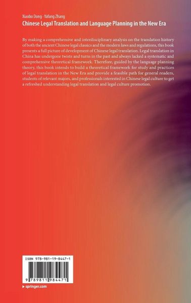 By making a comprehensive and interdisciplinary analysis on the translation history of both the ancient Chinese legal classics and the modern laws and regulations, this book presents a full picture of development of Chinese legal translation. Legal translation in China has undergone twists and turns in the past and always lacked a systematic and comprehensive theoretical framework. Therefore, guided by the language planning theory, this book intends to build a theoretical framework for study and practices of legal translation in the New Era and provide a feasible path for general readers, students of relevant majors, and professionals interested in Chinese legal culture to get a refreshed understanding legal translation and legal culture promotion.
