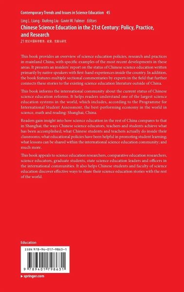 This book appeals to science education researchers, comparative educationresearchers, science educators, graduate students, state science educationleaders and officers in the international communities. It also helps Chinesestudents and faculty of science education discover effective ways to sharetheir science education stories with the rest of the world.