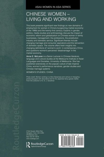 This book presents significant new findings on new domains of employment for women in China's burgeoning market economy of the 1990s and the twenty-first century. Experts in gender, politics, media studies, and anthropology discuss the impact of economic reform and globalization on Chinese women in family businesses, management, the professions, the prostitution industry and domestic service. Significant themes include changing marriage and consumer aspirations and the reinvention of domestic space. The volume offers fresh insights into changing definitions of 'women's work' in contemporary China and questions women's perceived 'disadvantage' in the market economy.