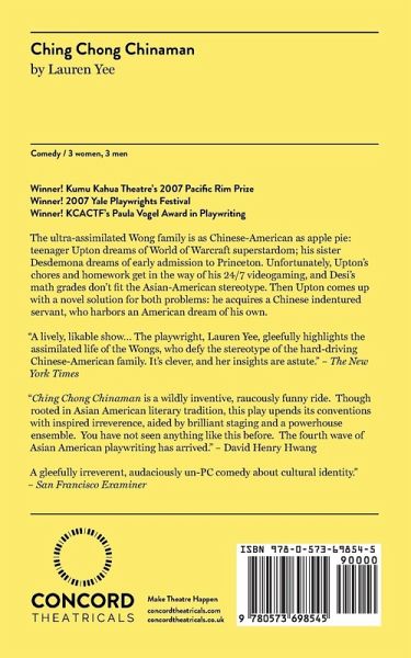 Characters: 3 male, 3 femaleComedyThe Wongs are American as apple pie. Desdemona dreams of Princeton but could use some help with her calculus. Her brother Upton wants to be a World of Warcraft champion but needs more free time to train. Upton solves both their problems by bringing an indentured servant home one day, but they soon discover that "Ching Chong" has American dreams of his own!An irreverent new comedy by Lauren Yee is skewering every clich¿ about Asian American identity.
