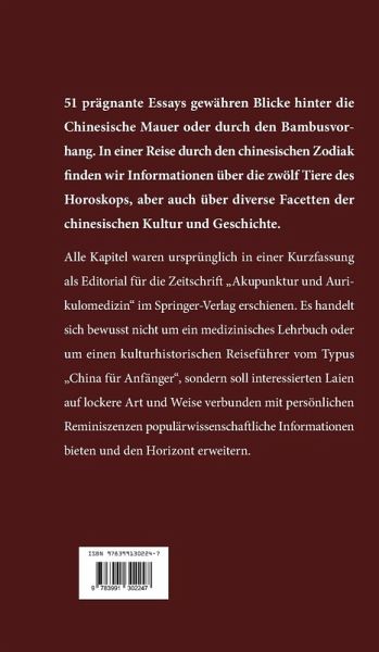 51 prägnante Essays gewähren Blicke hinter die Chinesische Mauer oder durch den Bambusvorhang. In einer Reise durch den chinesischen Zodiak finden wir Informationen über die zwölf Tiere des Horoskops, aber auch über diverse Facetten der chinesischen Kultur und Geschichte. Alle Kapitel waren ursprünglich in einer Kurzfassung als Editorial für die Zeitschrift "Akupunktur und Aurikulomedizin" im Springer-Verlag erschienen. Es handelt sich bewusst nicht um ein medizinisches Lehrbuch oder um einen kulturhistorischen Reiseführer vom Typus "China für Anfänger", sondern soll interessierten Laien auf lockere Art und Weise verbunden mit persönlichen Reminiszenzen populärwissenschaftliche Informationen bieten und den Horizont erweitern.