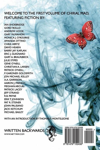 Chiral Mad is an anthology of psychological horror containing twenty-eight short stories by established authors and newcomers from around the world. All profit from sales of this anthology go directly to Down syndrome charities. Featuring the imaginations of Jack Ketchum, Gary Braunbeck, Gene O'Neill, Gary McMahon, Gord Rollo, Jeff Strand, Michael Bailey, and many others, with an introduction by Thomas F. Monteleone.