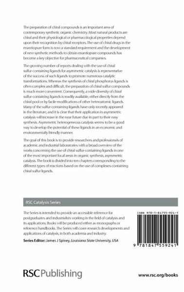 The preparation of chiral compounds is an important and challenging area of contemporary synthetic organic chemistry, mainly in connection with the fact that most natural products are chiral and their physiological or pharmacological properties depend upon their recognition by chiral receptors, which will interact only with molecules of the proper absolute configuration. The use of chiral drugs in enantiopure form is now a standard requirement for virtually every new chemical entity, and the development of new synthetic methods to obtain enantiopure compounds has become a key goal for pharmaceutical companies. The impressive number of reports dealing with the use of chiral sulfur-containing ligands for asymmetric catalysis is well representative of the success of such ligands to promote numerous catalytic transformations. Chiral sulfur-containing ligands represent a highly efficient class of ligands applicable in a broad variety of reaction types, also in view of some peculiar properties, which differentiate them from more popular ligands such as phosphorus- or nitrogen-containing ligands. Whereas the synthesis of chiral phosphorus ligands is often complex and difficult, the preparation of chiral sulfur compounds is much more convenient. Consequently, a wide diversity of chiral sulfur-containing ligands, more than forty different classes, is easily available either directly from the chiral pool or by facile modifications of other heteroatomic ligands. Many of the sulfur-containing ligands have only recently appeared in the literature, and it is clear that their application in asymmetric catalysis will undoubtedly increase in the near future for a number of additional asymmetric reactions, due in part to their easy synthesis. Moreover, due to their great stability, asymmetric heterogeneous catalysis seems to be a good way to develop the potential of these ligands in an economic and environmentally friendly manner. The goal of this book is to provide to researchers and professionals of academic and industrial laboratories with a broad overview of the works concerning the use of chiral sulfur-containing ligands in one of the most important focal areas in organic synthesis, asymmetric catalysis. The book is divided into ten chapters corresponding to the different types of reactions based on the use of complexes containing chiral sulfur ligands, such as:- * allylic substitution * conjugate addition * addition of organometallic reagents to aldehydes * addition of organozinc reagents to ketones * Diels?Alder reaction * cyclopropanation * Heck-type reactions * hydrogenation * hydrogen transfer * miscellaneous reactions