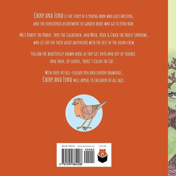 Chirp and Find is the story of a young man who goes missing, and the concerned assortment of garden birds who go to find him. Meet Robert the Robin, Skye the Goldfinch, and Mick, Nick & Chick the House Sparrows, who set off on their great adventure with the rest of the avian crew. Follow the beautifully drawn birds as they get into and out of trouble. And then, of course, there's Colin the Cat... With over 40 full-colour pen and crayon drawings, Chirp and Find will appeal to children of all ages.