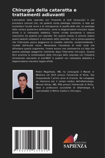 L'estrazione della cataratta con l'impianto di lenti intraoculari è una procedura comune che, nei pazienti senza patologie retiniche, è nota per aumentare l'acuità visiva e di conseguenza la qualità della vita. Le patologie della camera posteriore dell'occhio, come la degenerazione maculare legata all'età e la retinopatia diabetica, hanno un'alta prevalenza e spesso coesistono nei pazienti con cataratta. Per questo motivo, è comune vedere questi pazienti sottoposti a estrazione della cataratta, con la preoccupazione che l'intervento possa peggiorare le malattie retiniche, compromettendo i risultati dell'acuità visiva. Nonostante l'esistenza di molti studi che affrontano questo argomento, rimane ancora una controversia sul fatto che queste patologie peggiorino realmente dopo l'intervento chirurgico. Questo libro esamina la combinazione della chirurgia della cataratta con l'iniezione intravitreale adiuvante di anti-VEGF in pazienti con retinopatia diabetica e degenerazione maculare legata all'età.