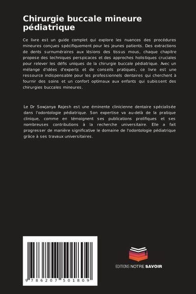 Ce livre est un guide complet qui explore les nuances des procédures mineures conçues spécifiquement pour les jeunes patients. Des extractions de dents surnuméraires aux lésions des tissus mous, chaque chapitre propose des techniques perspicaces et des approches holistiques cruciales pour relever les défis uniques de la chirurgie buccale pédiatrique. Avec un mélange d'idées d'experts et de conseils pratiques, ce livre est une ressource indispensable pour les professionnels dentaires qui cherchent à fournir des soins et un confort optimaux aux enfants qui subissent des chirurgies buccales mineures.