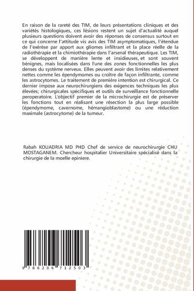 En raison de la rareté des TIM, de leurs présentations cliniques et des variétés histologiques, ces lésions restent un sujet d'actualité auquel plusieurs questions doivent avoir des réponses de consensus surtout en ce qui concerne l'attitude vis avis des TIM asymptomatiques, l'étendue de l'exérèse par apport aux gliomes infiltrant et la place réelle de la radiothérapie et la chimiothérapie dans l'arsenal thérapeutique. Les TIM, se développent de manière lente et insidieuses, et sont souvent bénignes, mais localisées dans l'une des zones fonctionnelles les plus denses du système nerveux. Elles peuvent avoir des limites relativement nettes comme les épendymomes ou croître de façon infiltrante, comme les astrocytomes. Le traitement de première intention est chirurgical. Ce dernier impose aux neurochirurgiens des exigences techniques les plus élevées; chirurgicales spécifiques et outils de surveillance fonctionnelle peroperatoire. L'objectif premier de la microchirurgie est de préserver les fonctions tout en réalisant une résection la plus large possible (épendymome, cavernome, hémangioblastome) ou une réduction maximale (astrocytome) de la tumeur.
